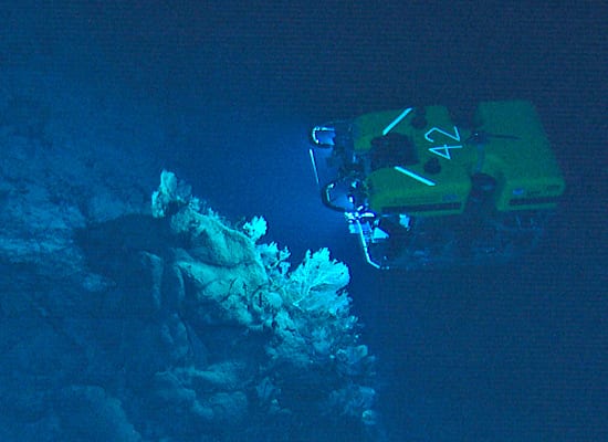 - The remotely operated vehicle Hercules (URI, IFE) collects corals from the Corner Rise seamounts and takes pictures of them during a 2005 expedition. (DASS05_URI_IFE_IAO_NOAA)