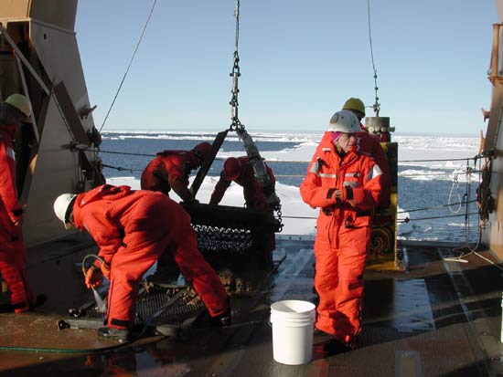 Working in the ice-covered Arctic Ocean in 2001, scientists and crew aboard the maiden voyage of the U.S. icebreaker Healy successfully—and surprisingly—were able to perform 200 dredge operations along the Gakkel Ridge, collecting some 4,000 seafloor rock samples. (Henry Dick.)- The 2001 AMORE (Arctic Mid-Ocean Ridge Expedition) collected SeaBEAM sonar data to create this detailed 1,000-kilometer (620-mile) bathymetric map of the Gakkel Ridge.