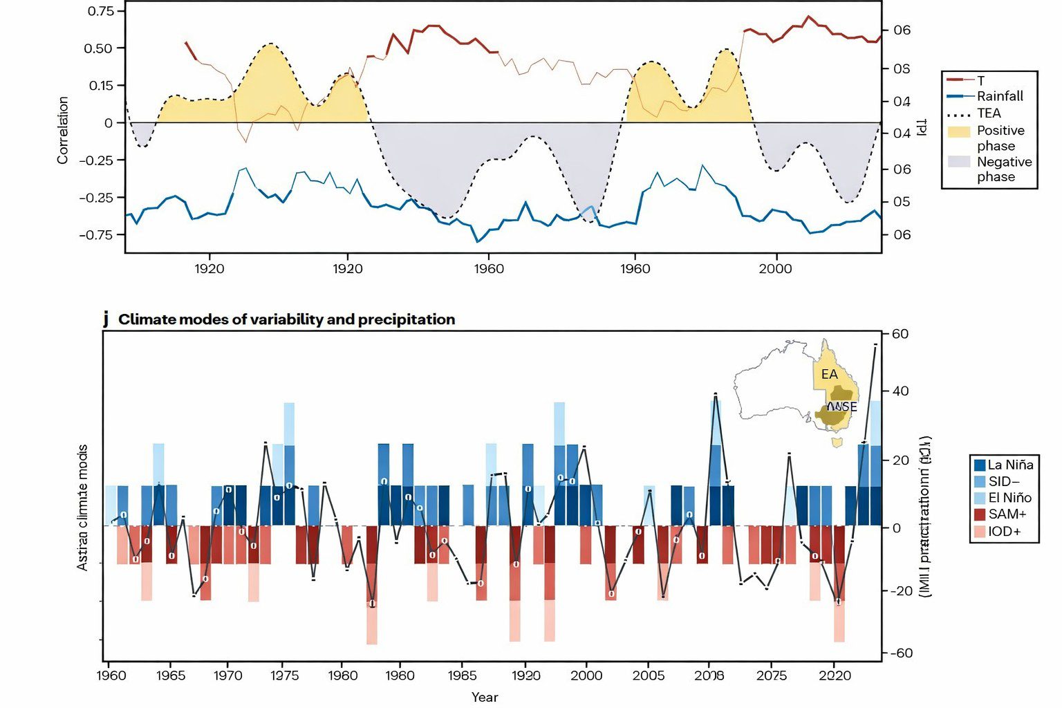 (Top) Multidecadal variability in the teleconnection, illustrated as the 14-year sliding correlation between September to November (SON) Niño3.4 and east Australian rainfall (blue line) and Tmax (red line). Thick portions of the lines show statistically significant correlation coefficients at the 90% confidence level. The Interdecadal Pacific Oscillation Tripole Index (TPI) filtered time series is overlaid (dotted line; positive and negative phases shaded yellow and grey, respectively). Australian Gridded Climate Data (AGCD) rainfall and HadISST data from 1900 to 2023. AGCD Tmax data available from 1910 to 2023. (bottom) Combined influence of ENSO, Indian Ocean Dipole (IOD), and Southern Annular Mode (SAM) on east Australian precipitation depicted by the time series of climate modes of variability and precipitation averaged over the Murray Darling Basin (MDB; line). East Australia (EA; yellow) and MDB (brown) regions are represented on the top-right map in the lower panel. [Adapted from Taschetto et al. 2025]