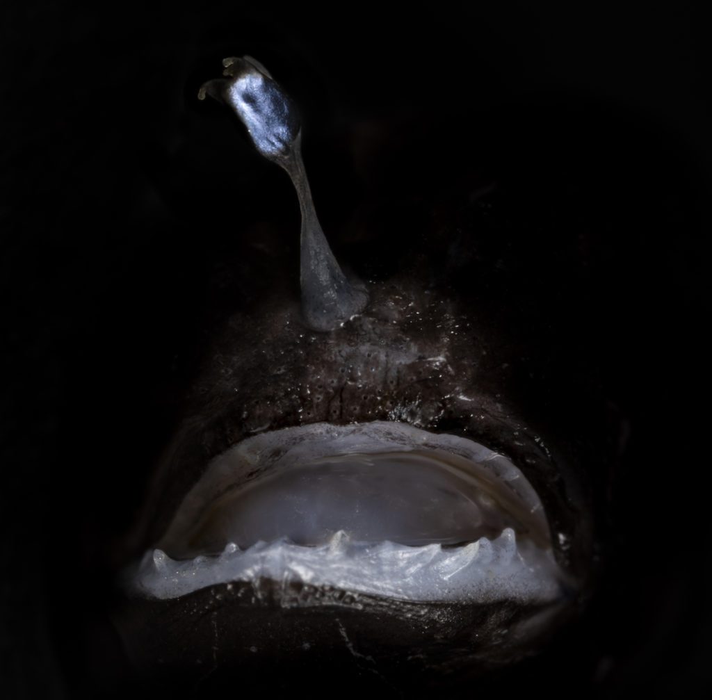 The source of light coming from this bulbous appendage, or “esca,” are bioluminescent bacteria. Although these provide bright flashes that entice prey to come near, they can’t illuminate on their own. In order to glow, the bacteria need some sort of cue from the anglerfish—suggesting a symbiotic relationship between the fish and microbes.