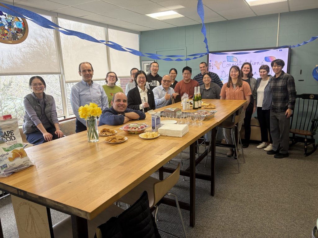 Dr. Phadtaya Poemnamthip celebrates a successful thesis defense along with fellow MIT/WHOI joint program students, chair of the defense, members of the thesis committee, friends and family. Dr. Poemnamthip’s doctoral dissertation defense was entitled Hydrodynamics of a Coral Atoll Lagoon and Its Connection to Large-Scale Climate Variability. Congratulations and best wishes to you, Dr. Poemnamthip! We are so proud of you!