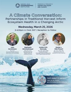 The presenters will be joined by two panelists for questions and conversation with the in person and online audience. Dr. Jordan R.M. Kennedy (AOPE) is WHOI’s Traditional Ecological Knowledge Postdoctoral Researcher who studies Anthro-engineering and is also an experienced tribal liaison. WHOI’s Dr. Hauke L. Kite-Powell (MPC) will share his perspective on management, policy and economics of marine resources. The event will conclude with a reception.