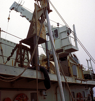 Researchers position a corer for deployment from the side of a research vessel. (Sea Education Association)