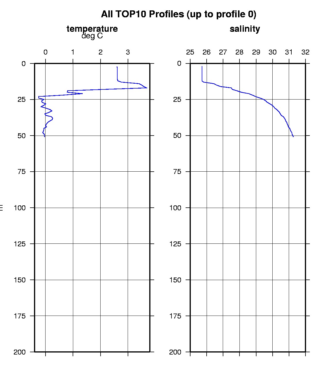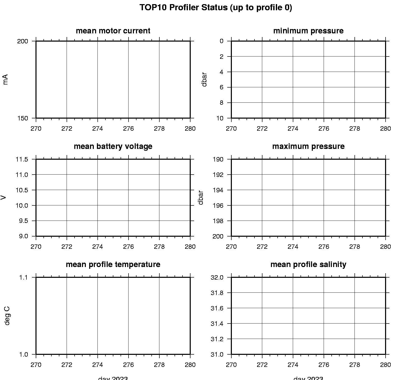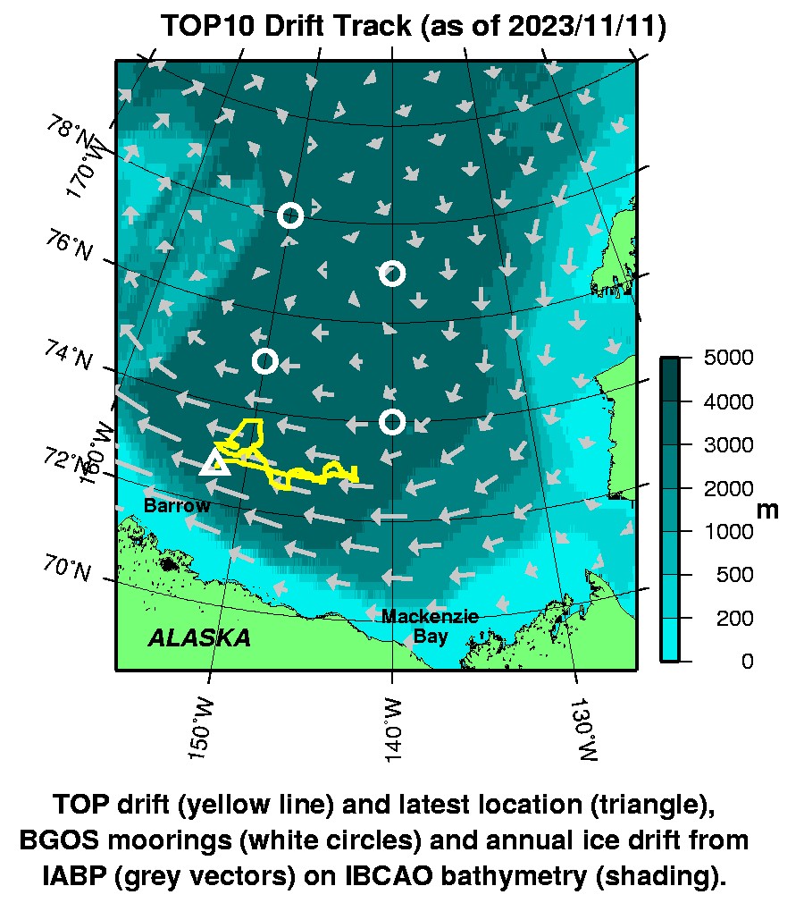 Tethered Ocean Profiler 10 Data Data from TOP10 deployed in October 2023 Last buoy status on 2023/11/11 160132 UTC : temperature = -15.625 °C, battery = 10.795 V Last position on 2023/11/11 160132 UTC : 72.7296° N, 152.1232° W Last profile (number 0) on 2023/10/4 33 UTC Last profile mean motor current = 157.8352 mA, mean battery = 12.7974 V Last profile depth: minimum = 2.456, maximum = 50.8897 m Last profile temperature: minimum = -0.25608, maximum = 3.6711 °C Last profile salinity: minimum = 25.7087, maximum = 31.2667 The raw GPS buoy location data are available in an ASCII file: top10rawlocs.dat Depth averaged profiler data files (with interpolated location) are available in two formats: TOP10 was deployed in open water in the Beaufort Sea on October 3, 2023 at 73° 2.9 N, 179° 57.7 W as part of the Beaufort Gyre Observing System (BGOS) during the JOIS 2023 cruise on the CCGS Louis S. St. Laurent. The TOP is operating on a standard sampling schedule of 6 two-way profiles from the surface to 200 m depth each day.