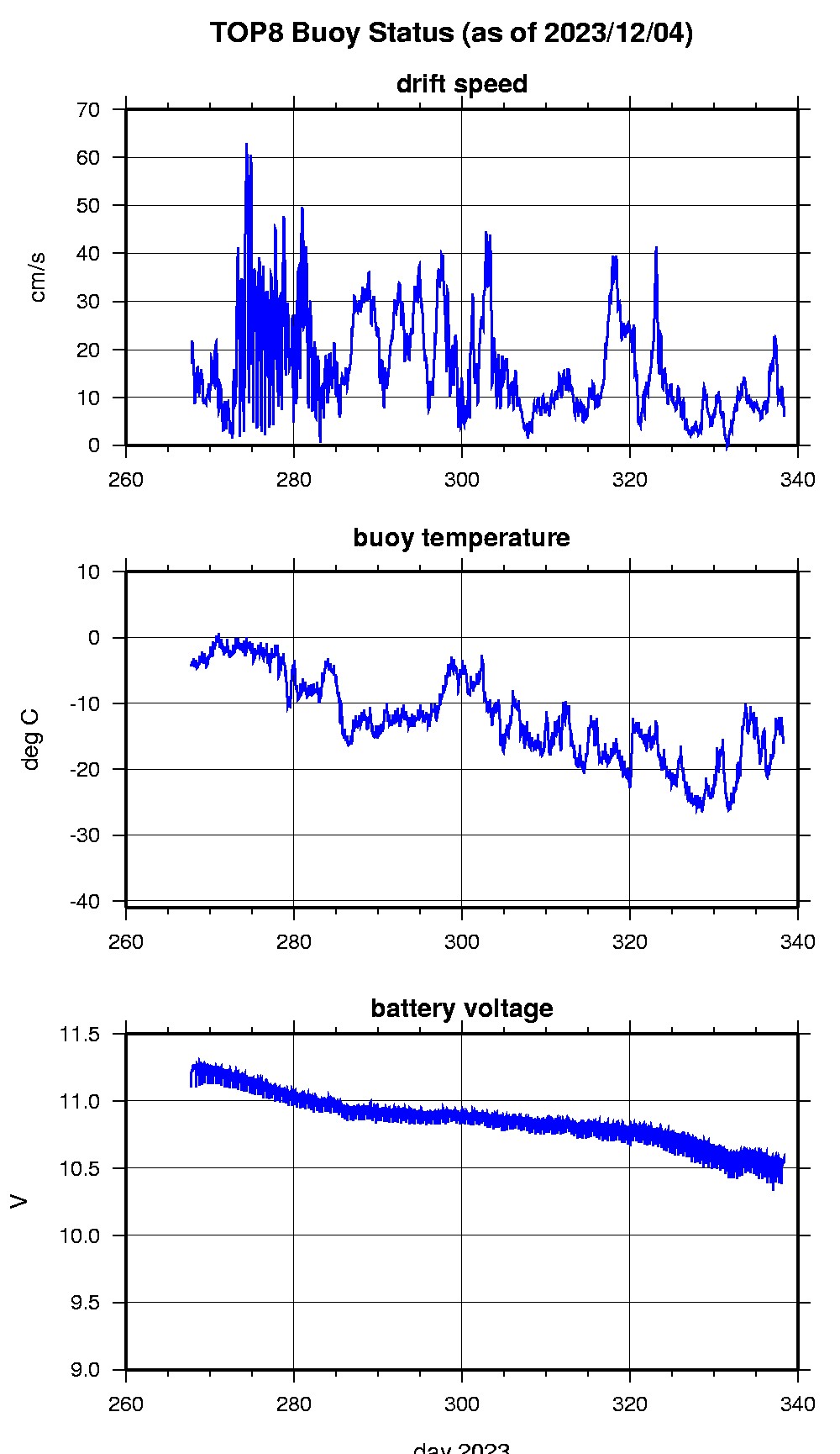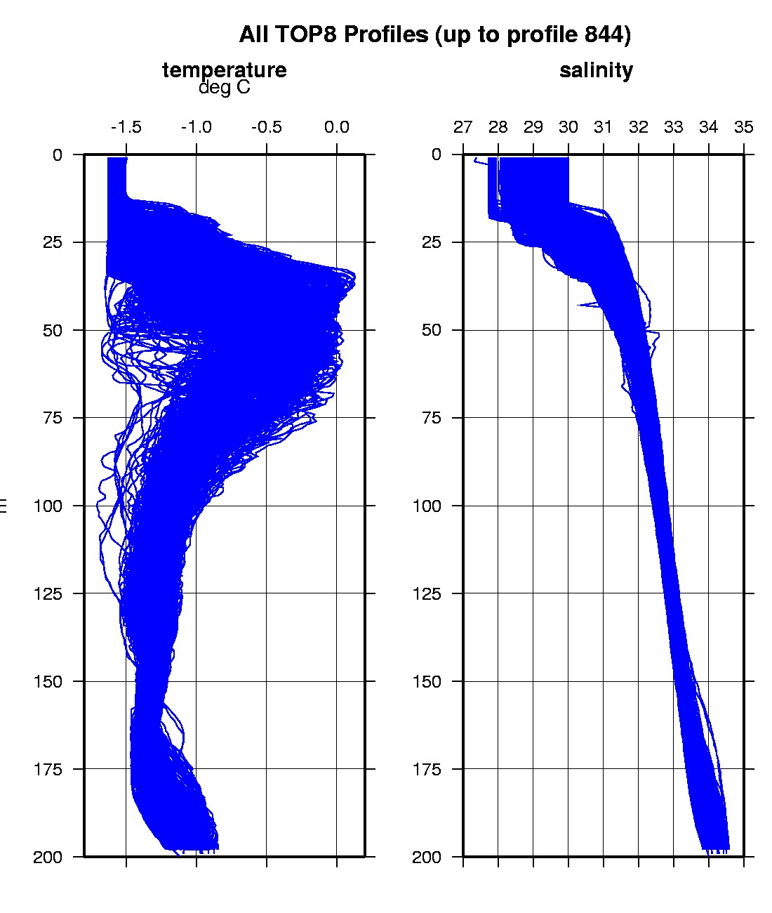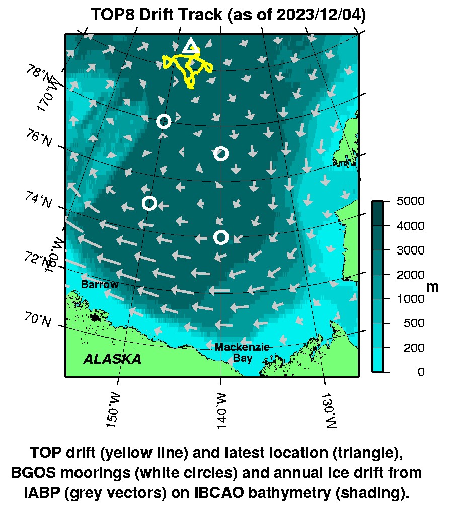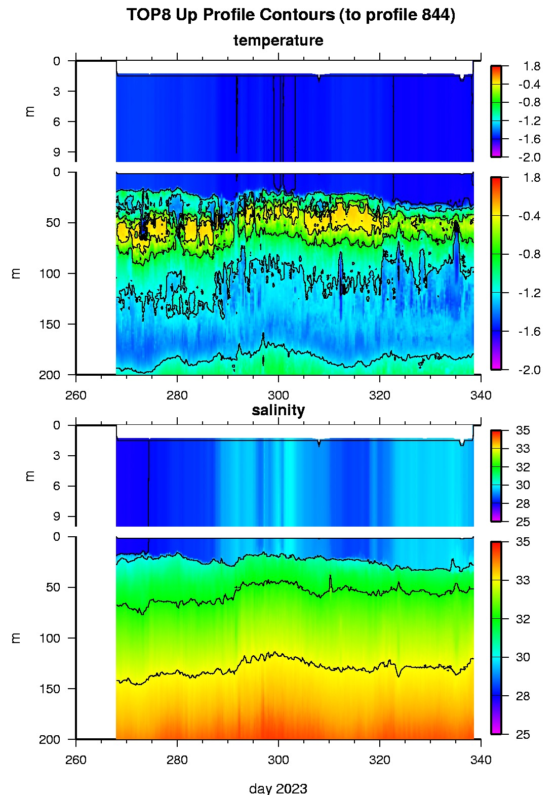 Tethered Ocean Profiler 8 Data Data from TOP8 deployed in September 2023 Last buoy status on 2023/12/4 83014 UTC : temperature = -16.0625 °C, battery = 10.56 V Last position on 2023/12/4 83014 UTC : 80.7767° N, 146.8504° W Last profile (number 844) on 2023/12/4 833 UTC Last profile mean motor current = 67.7377 mA, mean battery = 10.5624 V Last profile depth: minimum = 1.1919, maximum = 198.0909 m Last profile temperature: minimum = -1.6282, maximum = -0.37612 °C Last profile salinity: minimum = 29.3258, maximum = 34.3937 The raw GPS buoy location data are available in an ASCII file: top8rawlocs.dat Depth averaged profiler data files (with interpolated location) are available in two formats: TOP8 was deployed on a 0.4 m thick ice floe in the Beaufort Sea on September 24, 2023 at 78° 21.6 N, 140° 27.7 W as part of the Beaufort Gyre Observing System (BGOS) during the JOIS 2023 cruise on the CCGS Louis S. St. Laurent. The TOP is operating on a standard sampling schedule of 6 two-way profiles from the surface to 200 m depth each day.