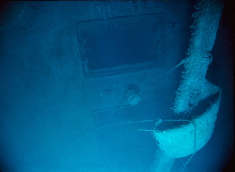 Part of the starboard quarter of the ship's stern, which separated from the rest of the ship. (©Woods Hole Oceanographic Institution)