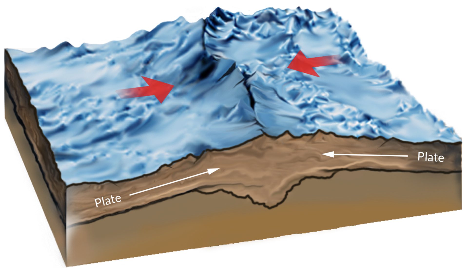 When two plates carrying continents collide, the continental crust buckles and rocks pile up, creating towering mountain ranges. The Himalayas were born when the Indian subcontinent smashed into Asia 45 million years ago. The Himalayas are still rising today as the two plates continue to collide. The Appalachian Mountains and Alps also formed in this way. (Illustration by E. Paul Oberlander, © Woods Hole Oceanographic Institution)