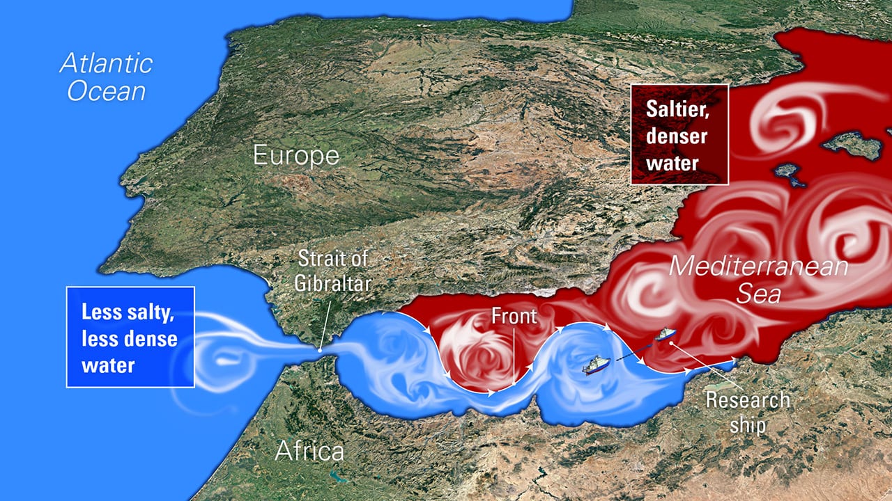 Through the narrow Strait of Gibraltor, water from the Atlantic Ocean enters the Mediterranean Sea. The Atlantic water is less salty and less dense than saltier Mediterranean water, so the two water masses create a “front.” At the front, the denser Mediterranean water sinks beneath the Atlantic water. The lighter water rises toward the sunlit surface, bringing with it nutrients that fuel the growth of plankton. MIT-WHOI Joint Program student Mara Freilich and her advisor Amala Mahadevan have been studying this key phenomenon to learn where and how productive areas of the ocean can be found. (Illustration by Eric S. Taylor, Google Earth, Woods Hole Oceanographic Institution Creative Studio)