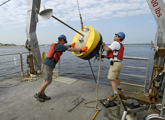 - Postdoc Dave Ralston and Jay Sisson aboard coastal vessel Tioga recover a surface buoy from the Merrimack River. The round object at the top of the buoy is a radar reflector. (Photo by James Kent, Woods Hole Oceanographic Institution)