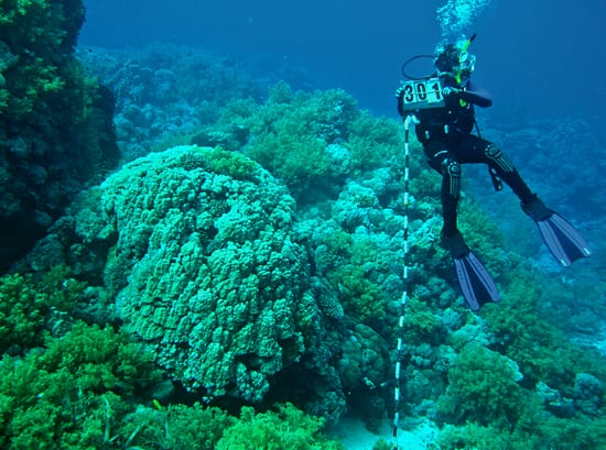 - Through a research agreement with King Abdullah University of Science and Technology, WHOI scientists are studying coral reef ecosystems, fisheries, and water circulation along Saudi Arabia’s Red Sea coast. The first priority is to assess the health of extensive coral reefs and identify environmental factors affecting them. This work involves commercial dive boats, local dive-tour operators, and coral measurements by WHOI scientists, including MIT/WHOI Joint Program student Jessie Kneeland, shown here. These studies will provide a baseline for monitoring this vital and still-unspoiled ecosystem in a time of ongoing coastal development and climate change. (Photo by Konrad Hughen, Woods Hole Oceanographic Institution)