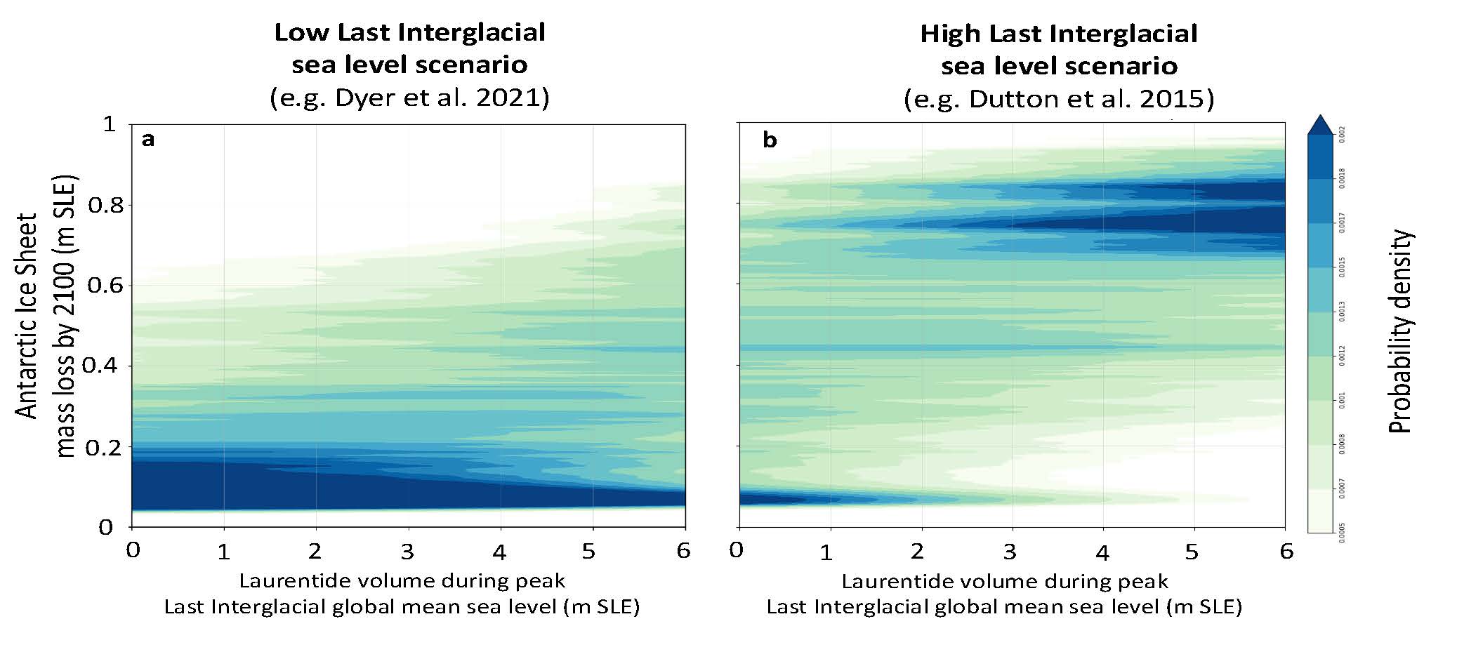 Projections of Antarctic Ice Sheet (AIS) mass loss by 2100 under a very high emissions scenario (RCP8.5) for (a) low—1.2-5.3 meters, 95% credible interval (Dyer et al., 2021)—and (b) high—μ = 7.6, σ = 1.6 (Dutton et al., 2015)—Last Interglacial peak GMSL scenarios in which the Laurentide Ice Sheet retains ≤6 meters global mean sea level (GMSL) equivalent volume. Projections follow Dutton et al. (2015) in assuming that during peak GMSL, thermosteric and mountain glaciers contribute 1 ± 0.2 m and the Greenland Ice Sheet contributes 2 ± 1.5 m. Calculations are performed using the Gaussian process emulation framework of Gilford et al. (2020).