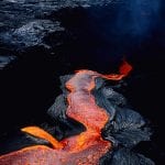Less explosive volcanoes produce effusive, or continuous, eruptions like those in some of the Hawaiian Islands’ active cones. Known as shield volcanoes for their distinctive shape, Hawaii’s land-based and underwater volcanoes send molten rock from cracks in their flanks flowing in sheets down their slopes. This material cools into many different forms, including pahoehoe (ropy lava) or aa (rough and rocky) at the surface. Underwater, lava cools rapidly into pillow lava, round and bulbous, where the inner rock remains hot inside a cooled orb-like crust, erupting into chains of connected “pillows.” These and other volcanic rock types are called igneous rocks.