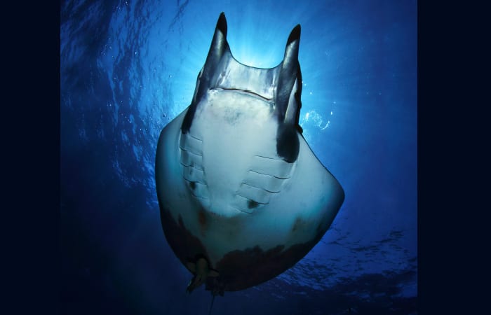 Photographer Nuno Sá captured this image of the underside of an 8-foot-long Chilean devil ray (Mobula tarapacana) on Ambrosia Seamount off the island of Santa Maria in the Azores.