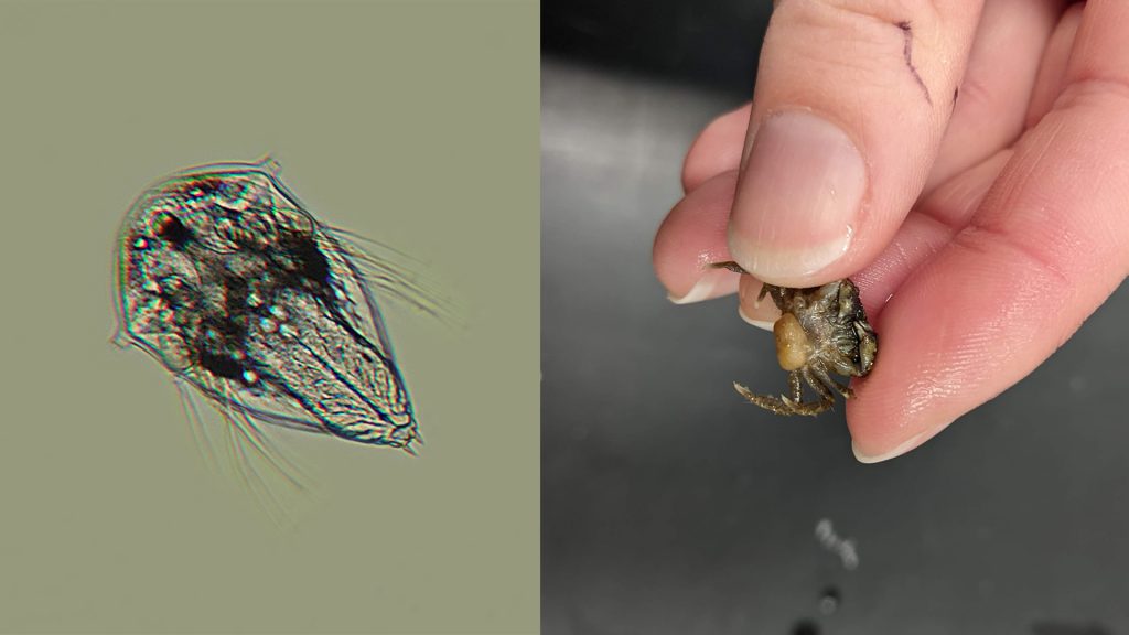(Left) A larva of the parasitic barnacle Loxothylacus panopaei under a microscope. (Right) A barnacle grows on a mud crabs brood pouch. (Photos courtesy of Carolyn Tepolt, © Woods Hole Oceanographic Institution)