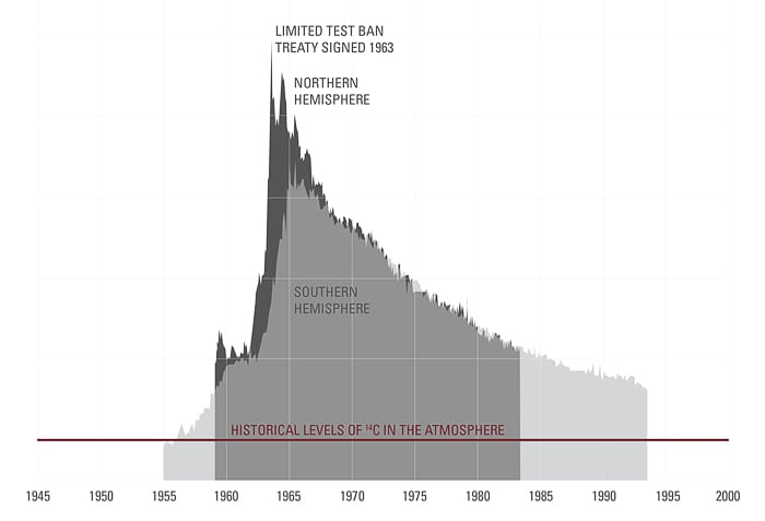 - Scientists are also looking for the chemical signature of a “bomb spike” lingering in the backbones of basking sharks to learn more about the sharks’ largely unknown lifestyle. Levels of radioactive carbon-14 in the atmosphere spiked in the late 1950s and early 1960s because of nuclear weapons testing. 14C levels in both the Northern (dark gray) and Southern (light gray) Hemispheres nearly doubled from historical levels until the 1963 Limited Test Ban Treaty prohibited testing in the atmosphere. (Based on GNUPLOT 4.2 patchlevel 2)