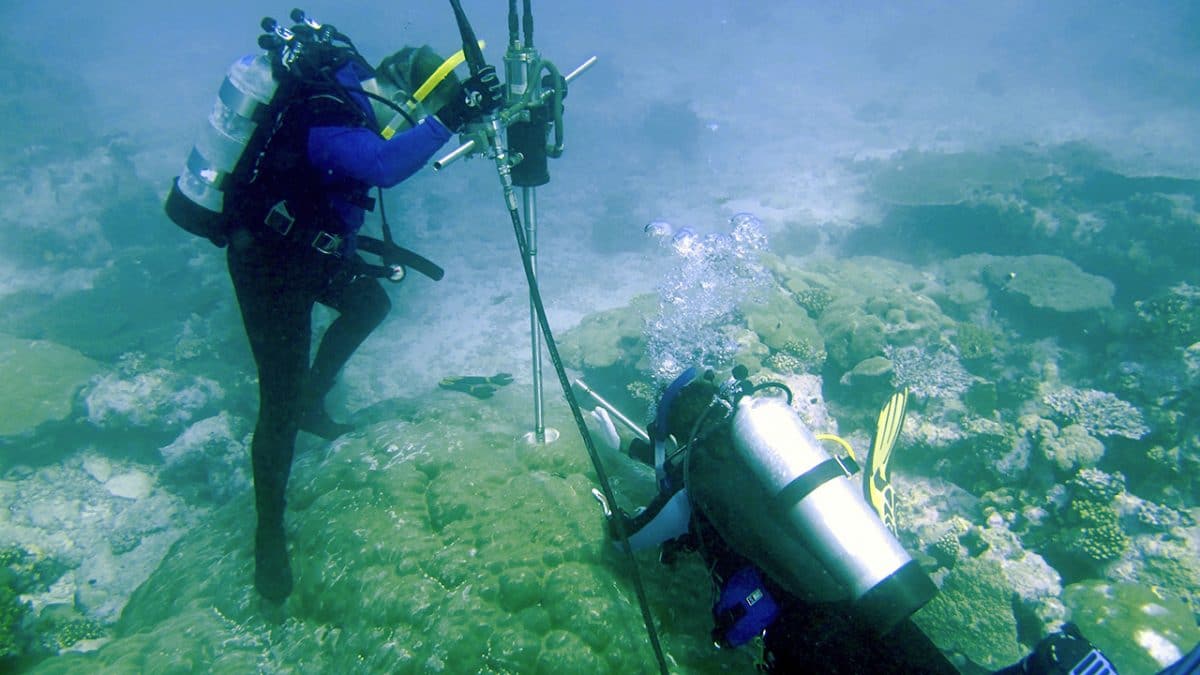 Off a small island in the Chagos archipelago in the Indian Ocean, Woods Hole Oceanographic Institution (WHOI) biogeochemists Konrad Hughen and Colleen Hansel use a special underwater drill to take a core sample from a boulder coral (Porites lobata) during an expedition in 2015 (top left).