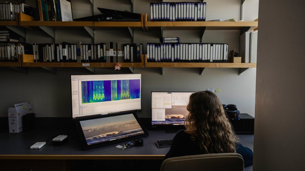 This particular whistle has a series of peaks and troughs like a financial chart. As Fligstein studies its waveforms on her screen, she cross-references field notes taken when the animal was present to identify it. Then, she checks that individual’s historical files to see if this recent whistle matches up with previous ones the dolphin has made.