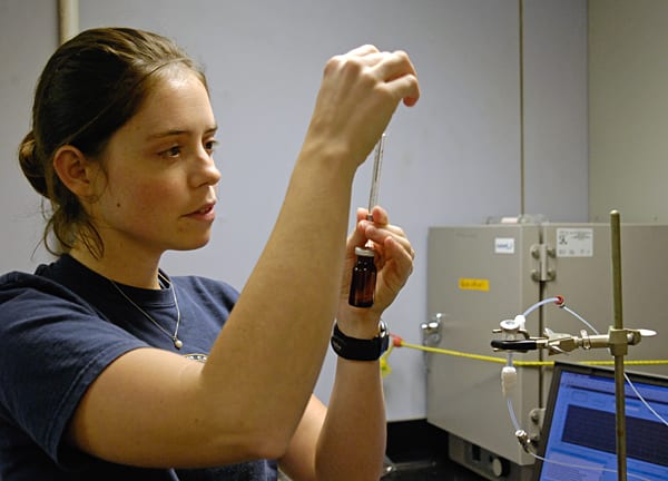 - Naomi Levine, a graduate student in the MIT/WHOI Joint Program, is studying a critical but little-known process called the "bacterial switch," by which a compound made by phytoplankton called dimethylsulfonionpropionate (DMSP) can be broken up by bacteria in two different ways. Each route leads to different impacts on the environment.(Photo courtesy of Naomi Levine, Woods Hole Oceanographic Institution)