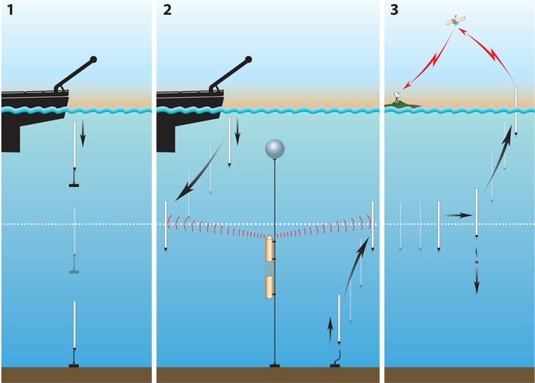 After completing their drifting mission, these floats release a second weight and rise to the sea surface, where they transmit all their stored data to orbiting satellites which then rebroadcast the information to ground stations (right).