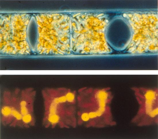 - THE INSIDE STORY—Richelia are cyanobacteria that live symbiotically inside single-celled marine plants called diatoms. The cyanobacteria have specialized dinitrogen-fixing cells that provide nitrogen to their hosts. Top: a light micrograph of the diatom Hemiaulus sp. Bottom: an epifluorescence light micrograph of the same cells, showing the red chloroplasts of the diatom and the orange fluorescence of the barbell-shaped endosymbiotic Richelia. (Photo by Dave Caron, Woods Hole Oceanographic Institution)