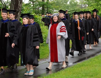 Nineteen graduates of the MIT/WHOI Joint Program in Oceanography and Applied Ocean Sciences and Engineering marched to receive their degrees June 5, 2010, during ceremonies at WHOI. Casey Saenger (left) holds the traditional ship’s belaying pin, the program’s nautical equivalent for the academic mace used in commencement processions.