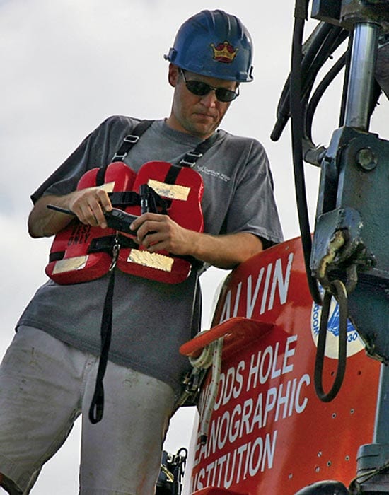 Eppard, 34, has spent approximately eight months a year at sea on R/V Atlantis since June 2001 to complete his training. It includes learning nearly 200 mechanical, hydraulic, computer, and electrical systems needed to operate Alvin and completing several oral examinations on operational systems, scientific sampling, engineering, and safety. Alvin pilots-in-training also make several dives with pilots before diving solo.