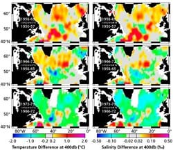 - Maps of temperature and salinity changes for successive time periods at a depth near 400 meters in the northern North Atlantic. Reds and yellows indicate that the later of the two periods is warmer or saltier, while blues and greens indicate the later period is cooler or fresher. Gray areas indicate small salinity and temperature change. White areas indicate a lack of data.