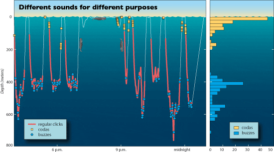 When whales begin a dive to find and capture prey, they start producing sounds called “regular clicks” roughly once per second, at depths of several hundred meters. They use the regular clicks, it seems, to orient themselves; for most regular clicks, the tag records sound echoes reflecting from both the ocean’s water surface and the bottom.