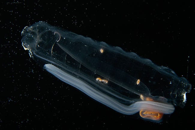 - Transparent tubular animals, salps produce a feeding net of mucus that hangs inside their bodies. As they swim, they catch food particles on the net. (Photo by Larry Madin, Woods Hole Oceanographic Institution)