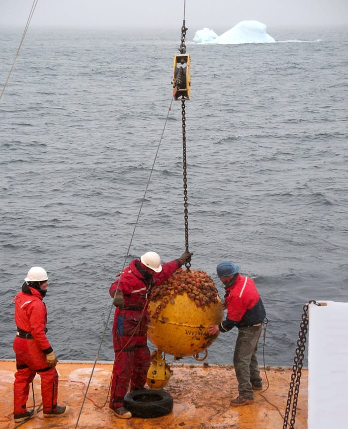 - WHOI mooring engineer Jim Ryder (blue hat) and two ship's crew members bring up the lost mooring float after ten years underwater. The float, which was suspended many meters beneath the surface and the Antarctic sea ice, is no longer the shiny yellow of a new float. Instead it is capped by a thick growth of marine organisms that settled on it over the years. (Photo by Kevin Sullivan, NOAA Atlantic Oceanographic and Meteorological Laboratory )