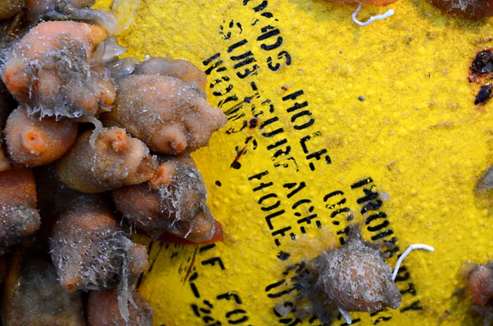 - The float from the ghost mooring proved a good home for sea squirts, squishy marine animals that settle on rocks and filter tiny planktonic animals from the water. Had the float drifted to inhabited lands, the "if found adrift, contact WHOI" message stenciled on the side might not have been legible because of the overgrowth. (Photo by Juan Botella, PolarTREC teacher)