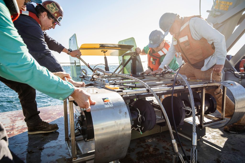 WHOI scientists and crew haul the deep-sea plankton imaging system Stingray back aboard the R/V Neil Armstrong during an NES LTER cruise in 2023. (Photo by Daniel Hentz, © Woods Hole Oceanographic Institution)