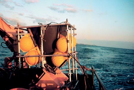 December 1997 — October 14, 1997: The predawn hours at sea have a unique feel—an eerie stillness, regardless of weather. This morning is no exception as the Bermuda Biological Station’s R/V Weatherbird II approaches the OFP (Oceanic Flux Program) sediment trap mooring some 75 kilometers southeast of Bermuda.