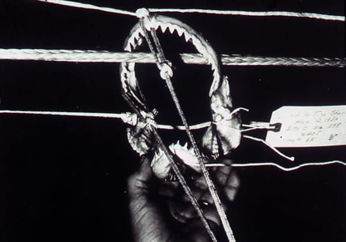- WHOI engineers developed the “Bitemeter” to measure the force needed to drive a sharp object, such as a shark’s tooth, into rigging components and to test the ability of those components to resist punctures by fish teeth. “It took a long time before we developed moorings that were resistant to sharks,” recalled former WHOI scientist Ferris Webster.
