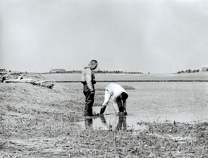 In 1969, WHOI biologists Howard Sanders (left) and George Hampson mobilized a concerted study of the impacts of an oil spill off West Falmouth, Mass., on marine organisms. (Courtesy of WHOI Archives)