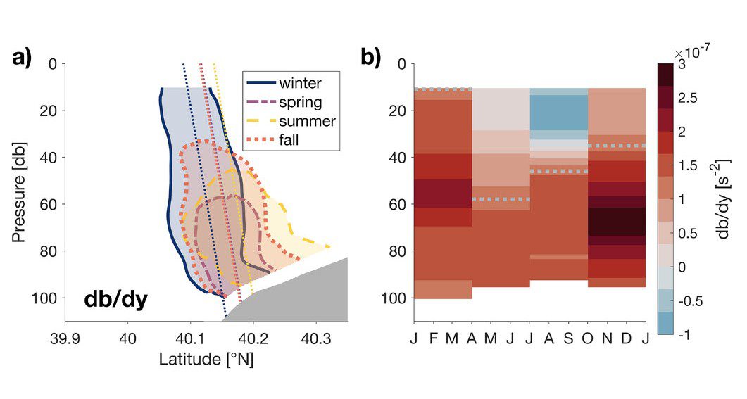Seasonal position and strength of the MAB shelfbreak front. (a) The shelfbreak frontal zone as identified by elevated cross-shelfbreak buoyancy gradient, i.e., the outline surrounding the region of Δby > 1.2 × 10−7 s−2. Thin dotted lines mark the central frontal axis through each season’s frontal zone center (note that the lines for spring and fall nearly overlap). (b) The strength of the front vs. depth, characterized by the cross-shelfbreak buoyancy gradient along each season’s central frontal axis [shown in (a)]. Horizontal dotted lines mark the top of the frontal zone along the frontal axis.