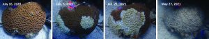 This coral in Fish Bay, St. John (U.S. Virgin Islands) shows the rapid progression of stony coral tissue loss disease. Observed and sampled during the study, it appeared dark brown and healthy in July 2020, but showed clear signs of disease by January 2021. By May 2021, the entire colony had died. (Photo by Sonora Meiling, University of the Virgin Islands)