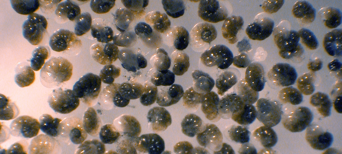 Light micrograph of the benthic foraminifer Nonionella stella, which thrives in anoxic sulfidic sediments far below the euphotic zone. Individuals are ~225 microns in diameter. Image credit: J.M. Bernhard. May 27, 2021