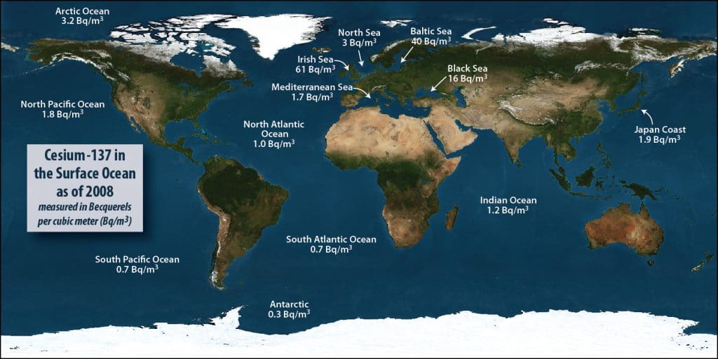 The normal background level of radiation is different for different places on the planet. Radiation in some places is higher because these receive less of the natural protection offered by Earth’s atmosphere or because they are in places where the surrounding rocks contain more radioactive substances, such as radon. In the ocean, the largest source of radiation comes from naturally occurring substances such as potassium-40 and uranium-238, which are found at levels 1,000 to 10,000 times higher than any sources of radiation caused by humans. The largest human release of radionuclides was the result of atmospheric nuclear weapons tests carried out by the U.S., France, and U.K. during the 1950s and 60s. Despite even the high concentration of nuclear fallout in the Pacific caused by U.S. tests on the Marshall Islands, there is no measurable health effect that would prevent us from eating seafood from the Pacific.