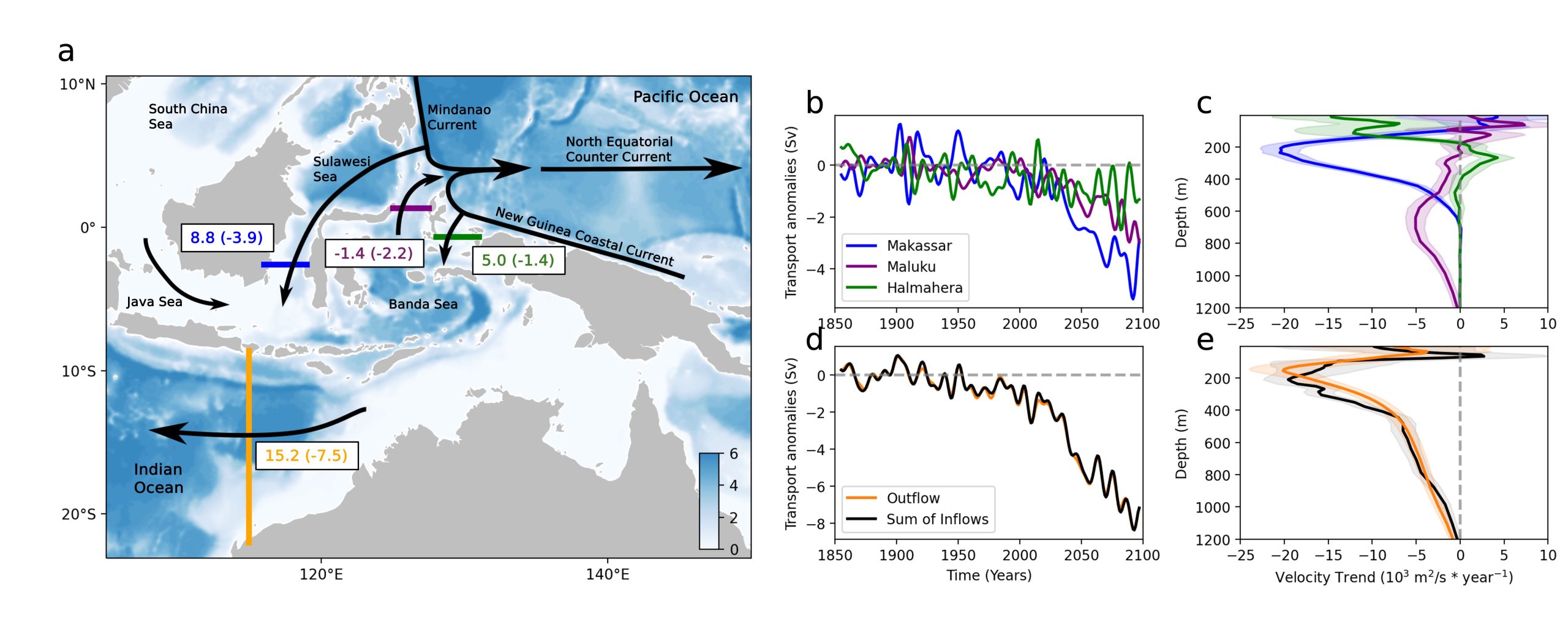 (a) Bathymetry of the Indonesian seas (in kilometers) with main ITF inflow and outflow pathways, Pacific upper ocean currents, and the Karimata Strait Throughflow shown as black arrows. The transects used to analyze Makassar Strait, Maluku Sea, Halmahera Sea, and ITF outflow transport are indicated by blue, purple, green, and orange lines, respectively. Transport magnitudes (in Sverdrups) averaged over the 1850–1950 period are also shown along with future (2080–2100) transport changes in parenthesis. Positive values denote southward/westward transport along the direction of the ITF. (b) Full‐depth transport anomalies (relative to 1850–1950) calculated for all three inflow passageways, (d) the sum of inflows and the ITF outflow. (c) Profiles of velocity trends spanning 2005–2100 for all three inflow pathways, (e) the sum of all three inflow profiles, and the ITF outflow. Velocity is multiplied by strait width at each depth. The 95% confidence intervals of velocity trends in (c), (e) are also shown (shading). Figure from Wang et al. (2026).