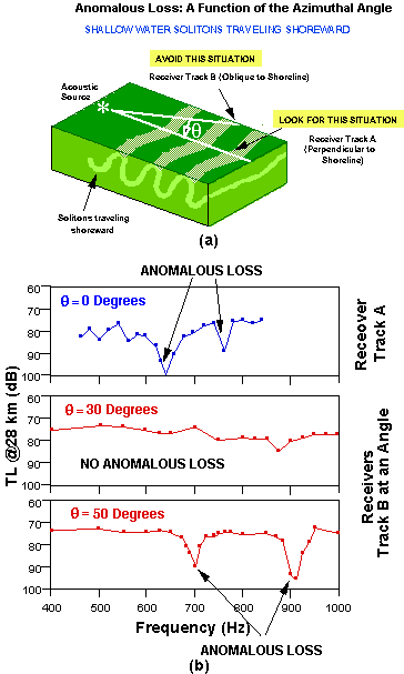 The stimulation for our study was initiated by the observation of an anomalous frequency response in shallow-water sound propagation measurements. In particular, acoustical measurements in the Yellow Sea conducted by Zhou, Zhang and Rogers[1] showed an anomalous drop in acoustical intensity, of about 30 dB, at a range of 28 km for acoustic frequencies around 630 Hz. The measured transmission loss was found to be time and direction dependent. The authors performed transmission loss calculations using an acoustic parabolic equation (PE) model and a gated sine function representation of solitons in the thermocline. The simulation results from this hypothetical case showed that an anomalous transmission loss can occur around 630 Hz when acoustical waves and solitons interact. Computer simulations subsequently confirmed [2,3] that the resonant like transmission loss is caused by an acoustical mode coupling due to the presence of solitons, together with a corresponding larger bottom attenuation for the coupled acoustic modes. At the "resonant" frequency (~630 Hz) acoustic modes are coupled and energy is passed from one mode to another. When the acoustic mode receiving the energy has a higher bottom attenuation than the other acoustic mode, a net loss in transmitted energy occurs. Over a long distance these losses become additive and can result in a large transmission loss. The entire process resembles a resonance phenomenon.[2,3]