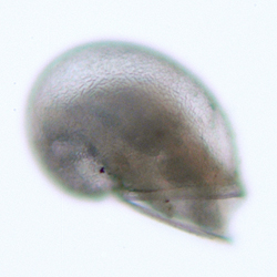 Lepetodrilus spp. protoconch is the most likely to be confused with Unknown 5. They are of similar size and in both the apertures are straight and line up with the base of the shell. In Unknown 5, however, the aperture, when seen from the side, appears to take up about two thirds of the diameter of the shell, whereas in Lepetodrilus spp. it is about half. Unknown 5's aperture rim is narrower and it flares out to the sides and at the outer edge, whereas Lepetodrilus spp.'s does not. Lepetodrilus has pitted sculpture rather than reticulate, but this is not usually obvious under the light microscope. In the bottom photo showing both species, Unknown 5 is on the right. |