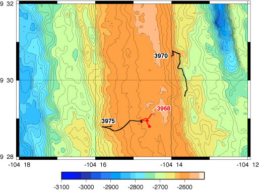 Multibeam bathymetry map of the East Pacific Rise showing updated locations of all Camera Tows carried during the cruise.