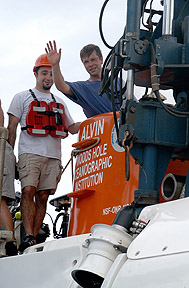 Wolfgang Bach (left) and Maurice Tivey prepare for their dive, #3975. It was Wolfgang's first dive in Alvin today. In right photo, Captain George Silva and Chief Engineer, Chris Morgan, survey the scene on Atlantis' decks from the Bridge wing.