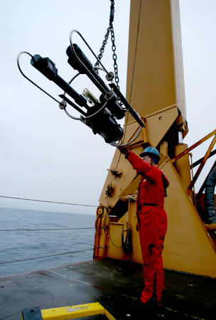 Sarah Zimmermann guides the VPR as the winch lifts it off the deck.