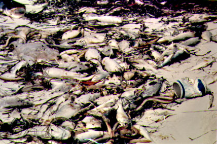 Pictured here are fish killed by red tide blooms, washed ashore either to accumulate on beaches or in small quiet coves near residential homes. These fish pose a health hazard as they rot and decay, and birds such as pelican, seagulls, comorants, and possibly marine mammals can become intoxicated by eating dead or dying fish. Photos Courtesy of the Florida Department of Environmental Protection.