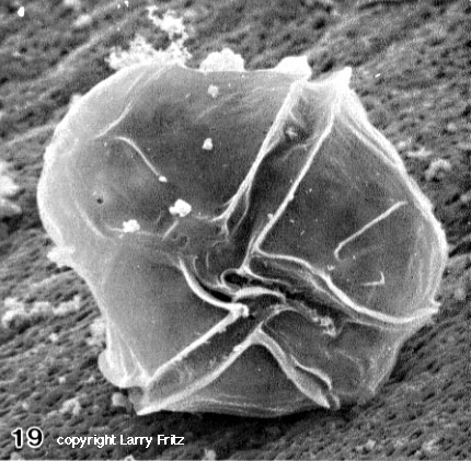 Other species kill without toxins, like this Chaetoceros species (left) which has spines with serrated edges which can lodge in fish gill tissues, causing irritation, over production of mucous, and eventual death. Each of these species, and many others, need careful study at the organismal level if we are to understand the population dynamics and trophic impacts of HAB's throughout the U.S. Photos by L. Fritz, J. Rines, and R. Horner.