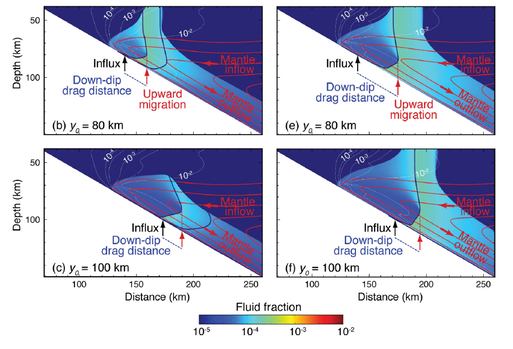 Our modeling results indicate that fluids introduced along the base of the mantle wedge beneath the fore arc are initially dragged downdip by corner flow due to the small grain size and low permeability immediately above the slab. As grain size increases with depth, permeability increases, resulting in upward fluid migration. Fluids released beneath the arc and the back arc are also initially dragged downdip, but typically are not transported as far laterally before they begin to travel upward. As the fluids rise through the back-arc mantle wedge, they become deflected toward the trench due to the effect of mantle inflow. The combination of downdip migration in the fore arc and trench-ward migration in the back arc results in pathways that focus fluids beneath the arc.
