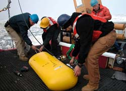 Its a slow process putting in a mooring of this size, and for the twenty people involved, a tiring and cold one too. The frigid arctic mist insidiously invaded the thickest of jackets, chilling us to the core. The ice repeatedly threatened to snag the mooring line, but each time the deck crew fended it off with long poles and clever shiphandling. Three hours later, the final buoy was bobbing in the water, waiting for the release. When we had drifted into position, Bob Pickart gave the OK, and the mooring was off to the bottom to collect data for 13 months. Given the setbacks we had suffered earlier, the successful mooring was a great victory. Seven more to go!