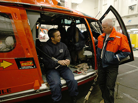 Petty Officer Dan Justice briefs Jim Ryder on his morning helicopter flight.